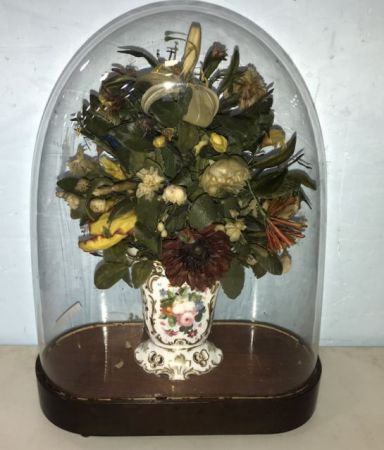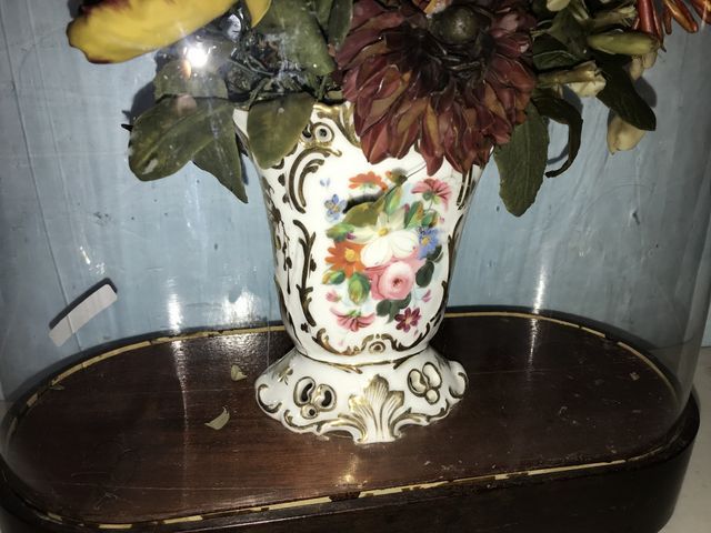 19th Century Wax Flowers and Old Paris Vase Under a Victorian Glass Dome, flowers are age fragile, dome is 20"h. 19th Century Wax Flowers and Old Paris Vase Under a Victorian Glass Dome, flowers are age fragile, dome is 20"h.