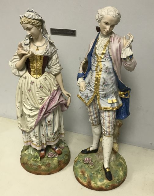 Pair of Antique Bisque Figurines Lady & Gentleman, hand painted, good condition, 20"h. Pair of Antique Bisque Figurines Lady & Gentleman, hand painted, good condition, 20"h.