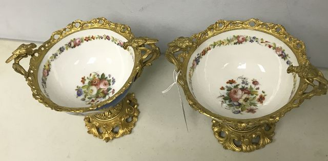 Pair of Sevres Blue Compotes w/ Gold Gilt Bronze Mounts Embellished w/ Parrots, Lizards, Turtles and Beetles, 7"h., 8"w. Pair of Sevres Blue Compotes w/ Gold Gilt Bronze Mounts Embellished w/ Parrots, Lizards, Turtles and Beetles, 7"h., 8"w.