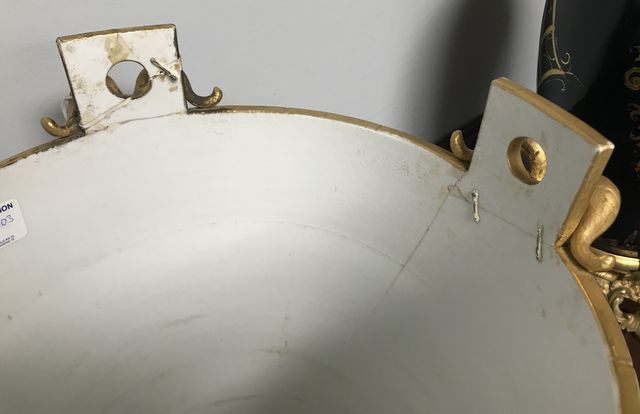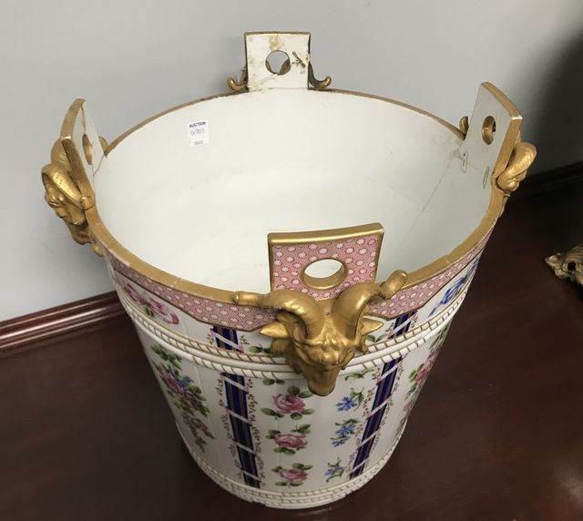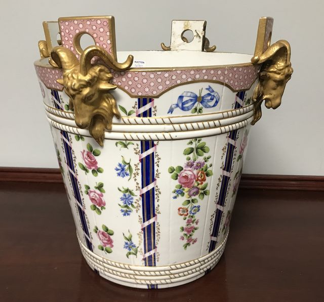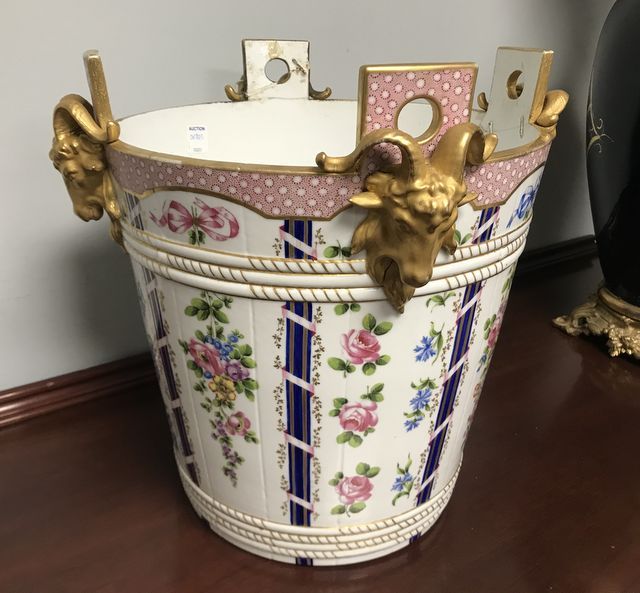 19th Century Sevres Milk Pail w/ Gold Ram Heads Rare, does have hair crack, and repair around the rim, hand painted, floral roses, gold gilt trim, 15"h., 14"dia. 19th Century Sevres Milk Pail w/ Gold Ram Heads Rare, does have hair crack, and repair around the rim, hand painted, floral roses, gold gilt trim, 15"h., 14"dia.