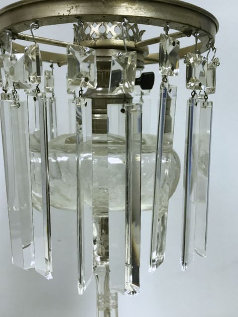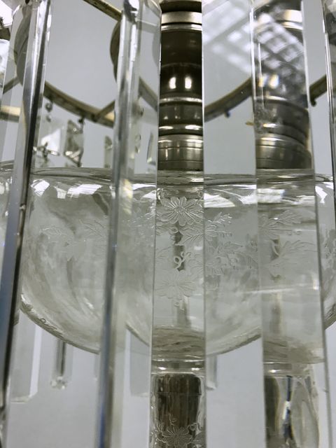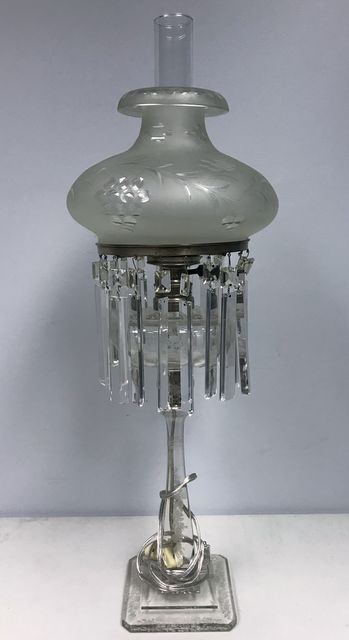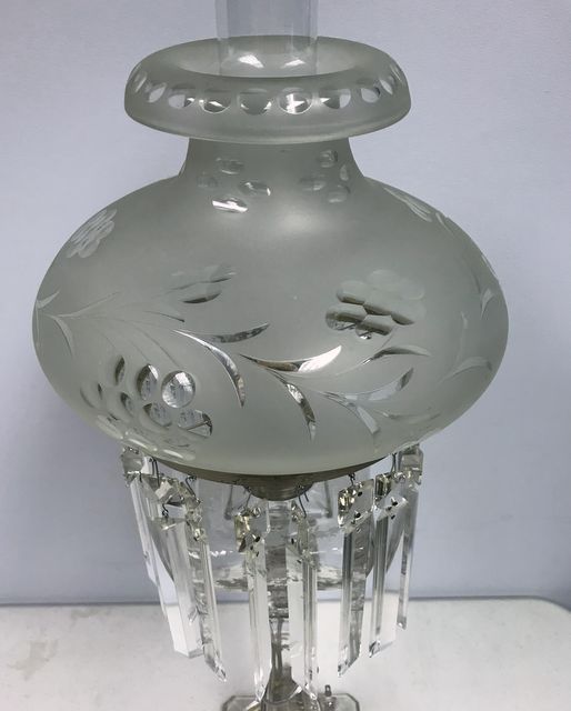 Antique Etched Astral Lamp, etched floral shade, hurricane shade, H: 32.5" W: 11" *missing one crystal charm. Antique Etched Astral Lamp, etched floral shade, hurricane shade, H: 32.5" W: 11" *missing one crystal charm.