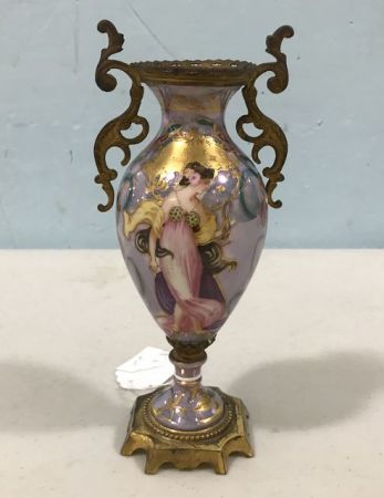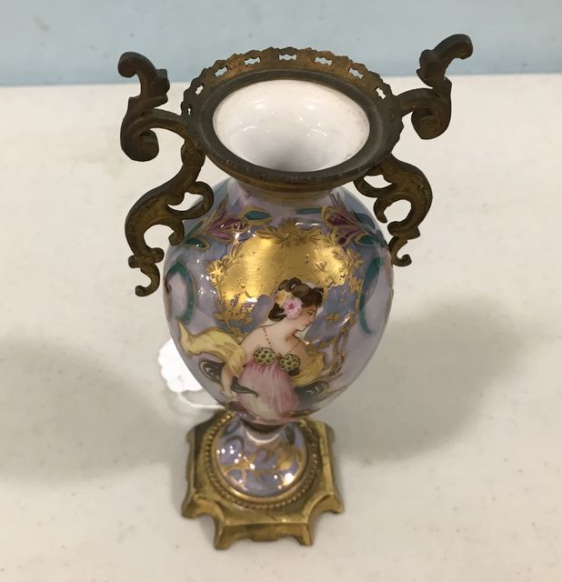 Sevres Art Nouveau Vase/Urn Small Signed, hand painted, portrait of women, France, porcelain with brass frame, 8"h. Sevres Art Nouveau Vase/Urn Small Signed, hand painted, portrait of women, France, porcelain with brass frame, 8"h.