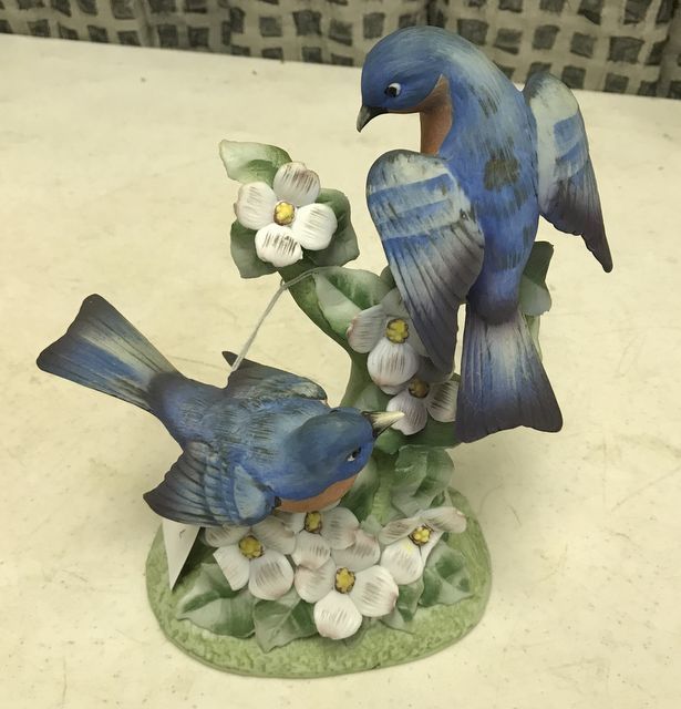 Lefton Hand Painted Pair of Blue Birds in Flowers, missing a petal, 7 1/2"h. Lefton Hand Painted Pair of Blue Birds in Flowers, missing a petal, 7 1/2"h.