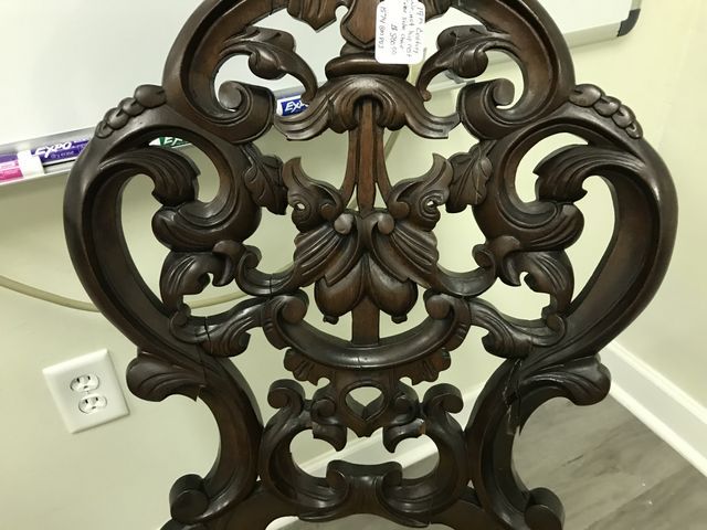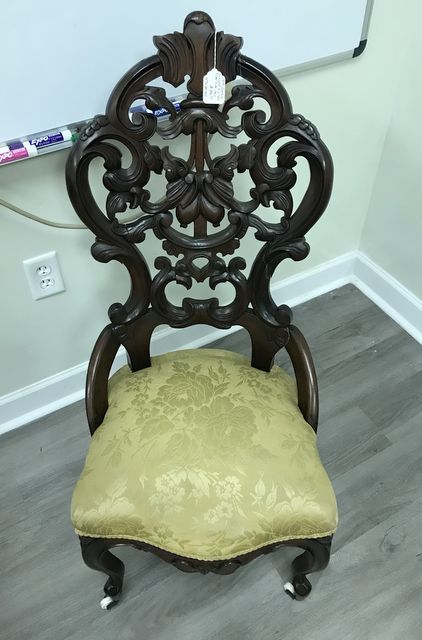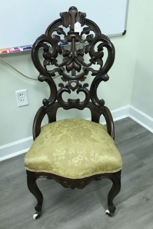 19th Century Walnut Hip Rest Parlor Side Chair, ornate carved back, dark finish, back has been repaired, gold upholstered seat, 37"h. 19th Century Walnut Hip Rest Parlor Side Chair, ornate carved back, dark finish, back has been repaired, gold upholstered seat, 37"h.