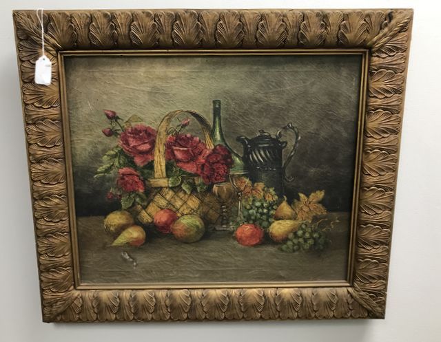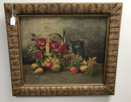 Antique Oil on Canvas in Gold Frame Roses in Basket, signed, on canvas, does have puncture, 26"h., 30"w. Antique Oil on Canvas in Gold Frame Roses in Basket, signed, on canvas, does have puncture, 26"h., 30"w.