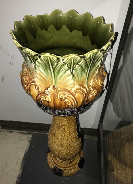Victorian Majolica Style Planter on Pedestal, has two chips on rim, one was re glued, hand painted, 36"h. Victorian Majolica Style Planter on Pedestal, has two chips on rim, one was re glued, hand painted, 36"h.