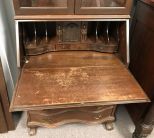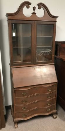 20th Century Mahogany Broken Pediment Drop Front Secretary, double glass doors, two wood shelves, four drawers, ball-n-claw Chippendale style, has wear spots, 78"h., 30"w., 16"d. 20th Century Mahogany Broken Pediment Drop Front Secretary, double glass doors, two wood shelves, four drawers, ball-n-claw Chippendale style, has wear spots, 78"h., 30"w., 16"d.