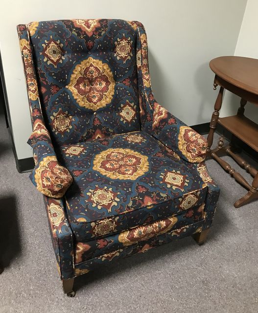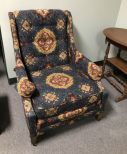 20th Century Blue Henredon, w/ Print Upholstered Arm Chair, arm covers. 20th Century Blue Henredon, w/ Print Upholstered Arm Chair, arm covers.