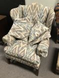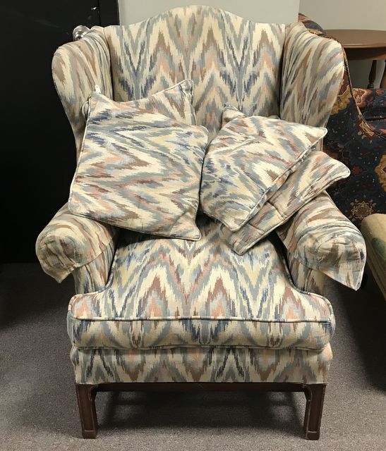 20th Century Wing Back Chair, arm covers, early American style, four throw pillows. 20th Century Wing Back Chair, arm covers, early American style, four throw pillows.