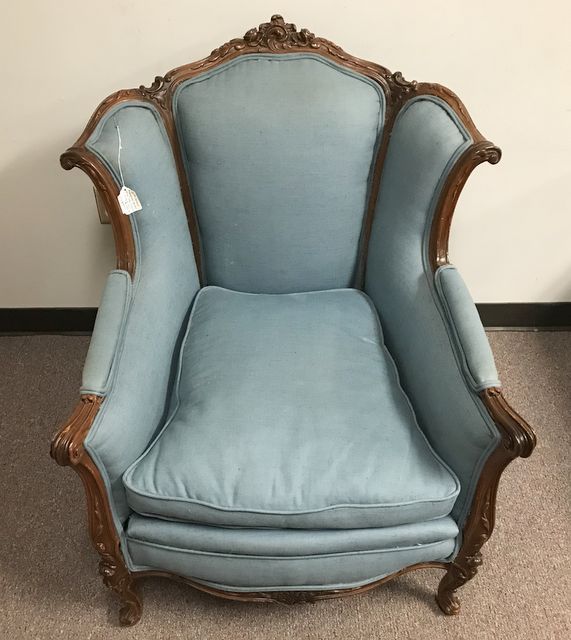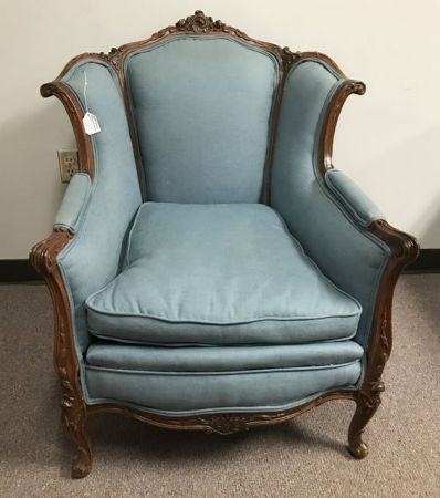 20th Century Mahogany Carved Blue Upholstered Wing Back Chair, French Style, light wear, 36"h. 20th Century Mahogany Carved Blue Upholstered Wing Back Chair, French Style, light wear, 36"h.