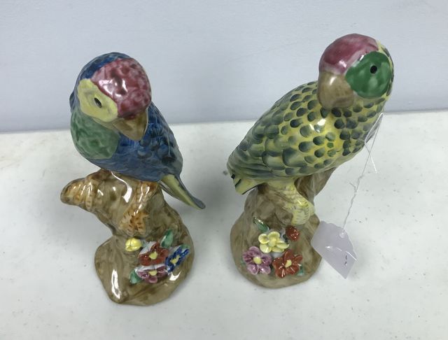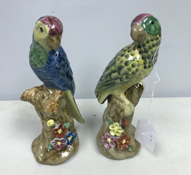 Pair of Vintage Porcelain Parrots, hand painted, one has broken tail. Pair of Vintage Porcelain Parrots, hand painted, one has broken tail.