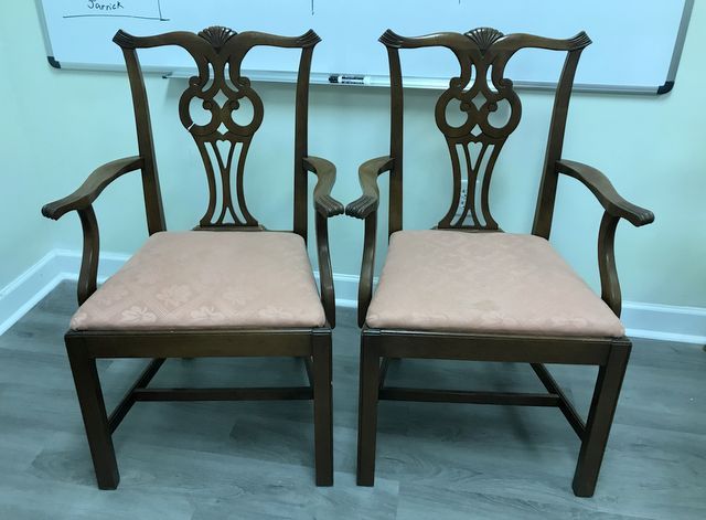 Pair of Hickory Chair Company Chippendale Armchairs Mahogany, light wear, upholstered cushions, 37"h. Pair of Hickory Chair Company Chippendale Armchairs Mahogany, light wear, upholstered cushions, 37"h.