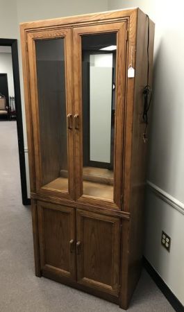 Oak Display Case, double door, two glass shelves, lighted, good condition, 78"h., 32"w., 17"d. Oak Display Case, double door, two glass shelves, lighted, good condition, 78"h., 32"w., 17"d.