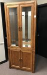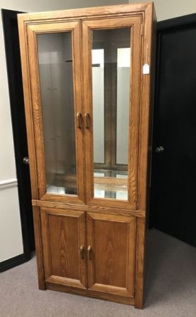 Oak Display Case, double glass door, two glass shelves, lighted, mirrored back, good condition, 78"h., 32"w., 17"d. Oak Display Case, double glass door, two glass shelves, lighted, mirrored back, good condition, 78"h., 32"w., 17"d.