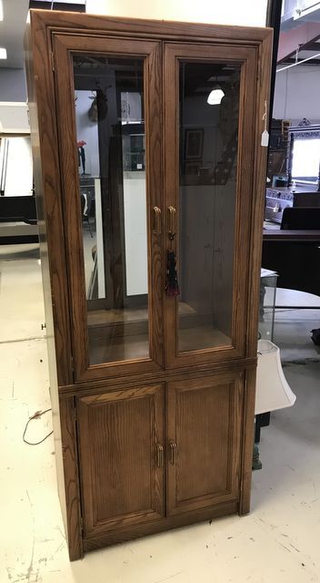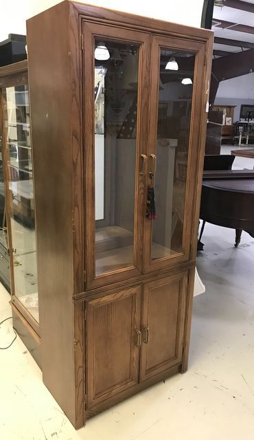 Oak Display Case, oak finish, double glass door, two glass shelves, mirrored back, 78"h., 32"w., 17"d. lighted, good condition. Oak Display Case, oak finish, double glass door, two glass shelves, mirrored back, 78"h., 32"w., 17"d. lighted, good condition.