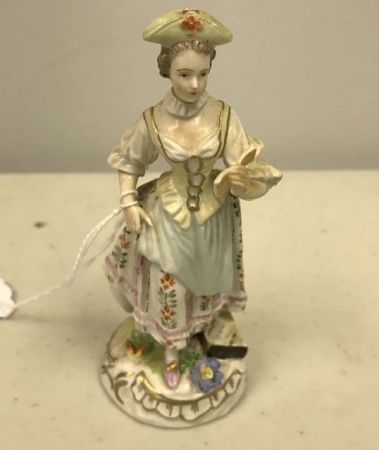 Dresden Figure Small Nurse, marked, hand painted, piece broken off top hat, 5"h. Dresden Figure Small Nurse, marked, hand painted, piece broken off top hat, 5"h.