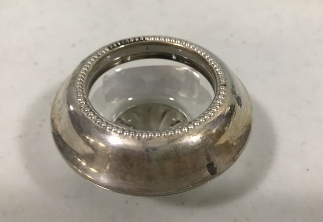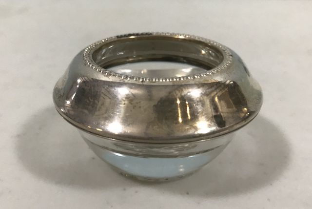 Sterling & Crystal Salt Cellars w/ Spoon, rim is sterling and spoon, 1"h., 2 1/2"dia. Sterling & Crystal Salt Cellars w/ Spoon, rim is sterling and spoon, 1"h., 2 1/2"dia.