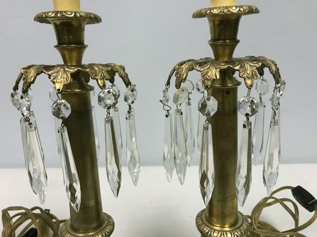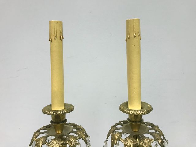 Pair of Period Bronze Candlestick Lamps, H: 18" *four replacement/extra crystal charms Pair of Period Bronze Candlestick Lamps, H: 18" *four replacement/extra crystal charms