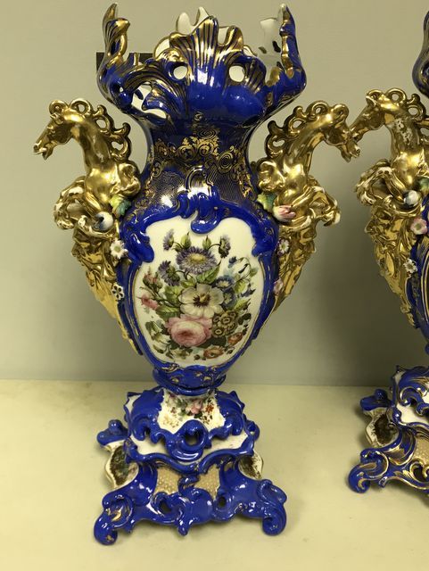 Rare Pair of Unusual Old Paris Vases w/ Horse Heals & North Winds, has some chips, and hair line crack in one vase. H: 19" Rare Pair of Unusual Old Paris Vases w/ Horse Heals & North Winds, has some chips, and hair line crack in one vase. H: 19"