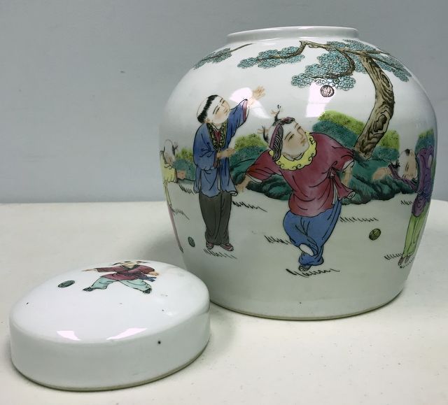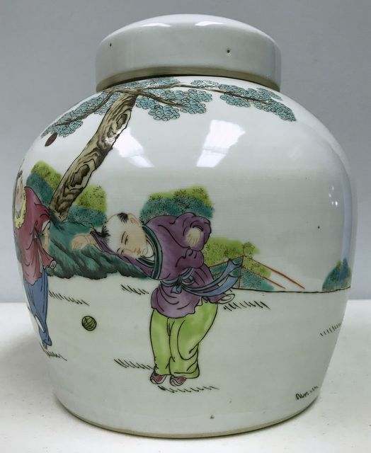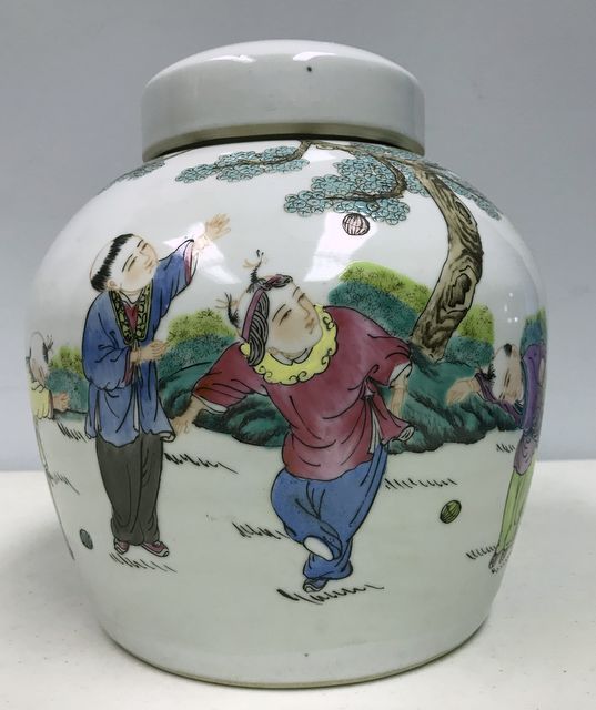 Oriental Ginger Jar w/ Lid, hand painted figures, porcelain, good condition, H: 11" Oriental Ginger Jar w/ Lid, hand painted figures, porcelain, good condition, H: 11"