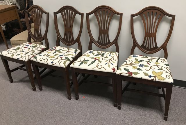 Four Vintage Mahogany Sheraton Style Dining Chairs, does have finish wear, embroidered floral cushion, four total, 37"h. Four Vintage Mahogany Sheraton Style Dining Chairs, does have finish wear, embroidered floral cushion, four total, 37"h.