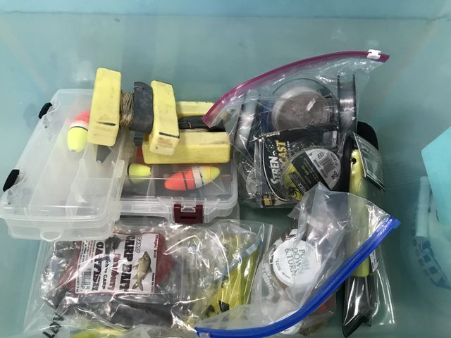Crate of Fishing Accessories, strings, floats, lures, etc. Crate of Fishing Accessories, strings, floats, lures, etc.