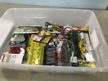 Crate of Fishing Lures, worms, baby boss, line. etc. Crate of Fishing Lures, worms, baby boss, line. etc.