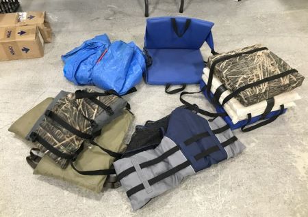 Group of Seat Pads, Life Jackets, Tarp, Seat, box not included. Group of Seat Pads, Life Jackets, Tarp, Seat, box not included.