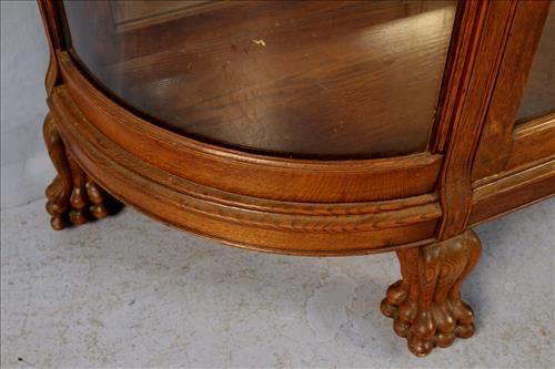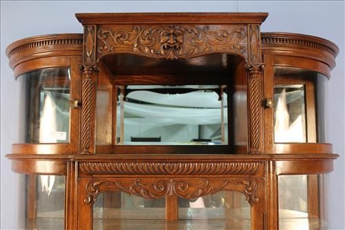 Oak curved glass china cabinet with beveled mirrors and back splash, man on the mountain carved crown, extremely large, 76 in. T, 51 in. W, 16 in. D. Oak curved glass china cabinet with beveled mirrors and back splash, man on the mountain carved crown, extremely large, 76 in. T, 51 in. W, 16 in. D.