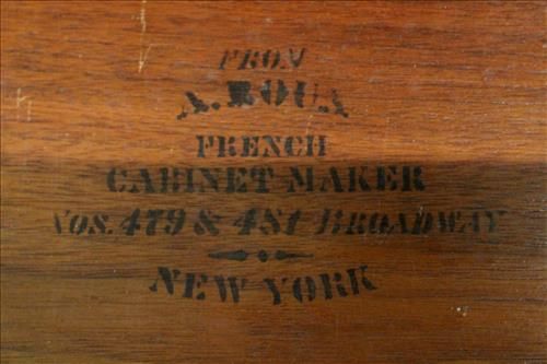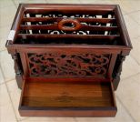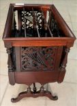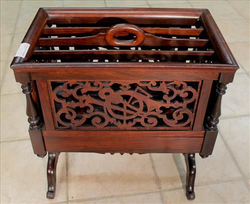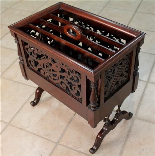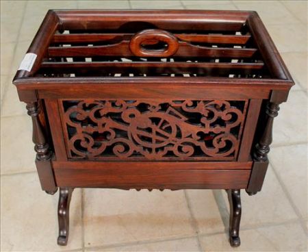 Walnut Victorian pierced carved canterbury , signed A. Roux, 24 in. T, 29.5 in. W, 14 in. D. Walnut Victorian pierced carved canterbury , signed A. Roux, 24 in. T, 29.5 in. W, 14 in. D.