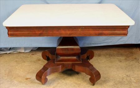 Oversize Empire mahogany center table with white marble, attar. to J. & J.W. Meeks, 29 in. T, 45 in. W, 35 in. D. Oversize Empire mahogany center table with white marble, attar. to J. & J.W. Meeks, 29 in. T, 45 in. W, 35 in. D.