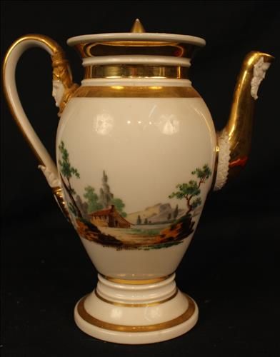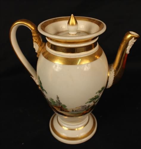 Old Paris chocolate pot with gold paint and scenes, face in the arm, 8 in. T, 8 in. W Old Paris chocolate pot with gold paint and scenes, face in the arm, 8 in. T, 8 in. W