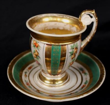 Old Paris cup and saucer, 4 in. T, 4.5 in. D. Old Paris cup and saucer, 4 in. T, 4.5 in. D.