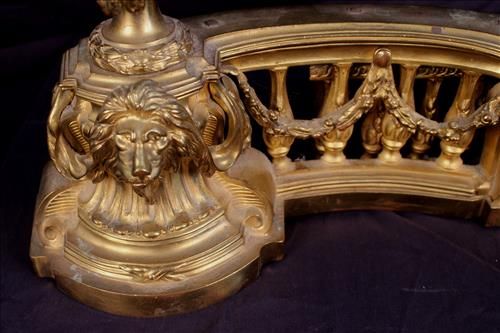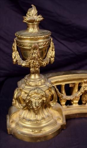 3 piece brass and bronze Victorian fireplace set with dogs and urns, adjustable width, andirons - 15 in. T, 17 in. L, Fender - 5 in. T, 24 in. L. 3 piece brass and bronze Victorian fireplace set with dogs and urns, adjustable width, andirons - 15 in. T, 17 in. L, Fender - 5 in. T, 24 in. L.