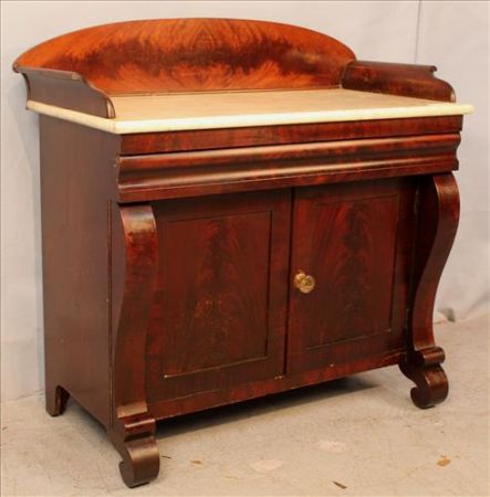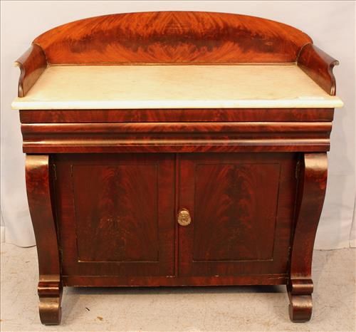 Empire marble top washstand with backsplash and scroll front, original to Temple Heights, ca. 1850, 35 in. T, 36 in. W, 17 in. D. Empire marble top washstand with backsplash and scroll front, original to Temple Heights, ca. 1850, 35 in. T, 36 in. W, 17 in. D.