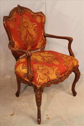 Set of 6 walnut French dining chairs, arm - 39.5 in. T, 23 in. W, 20 in. D. Set of 6 walnut French dining chairs, arm - 39.5 in. T, 23 in. W, 20 in. D.