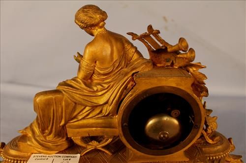 Dore bronze figural French clock, 12 in. T, 16 in. W, 6 in. D. Dore bronze figural French clock, 12 in. T, 16 in. W, 6 in. D.