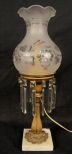Astral lamp with prisms and original shade, 20.5 in. T, 5 in. Sq, base. Astral lamp with prisms and original shade, 20.5 in. T, 5 in. Sq, base.