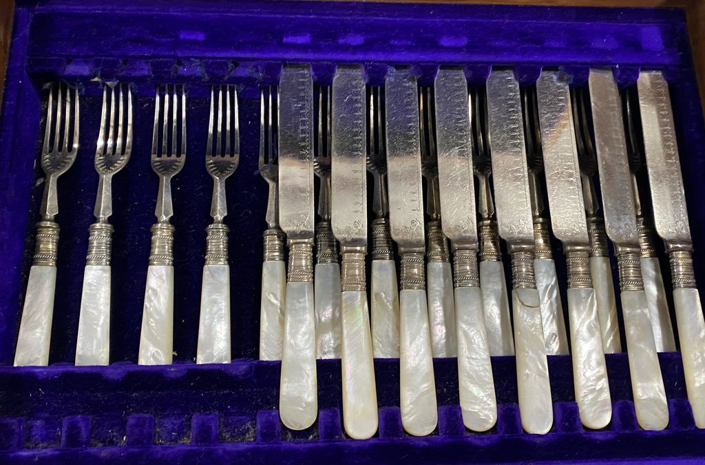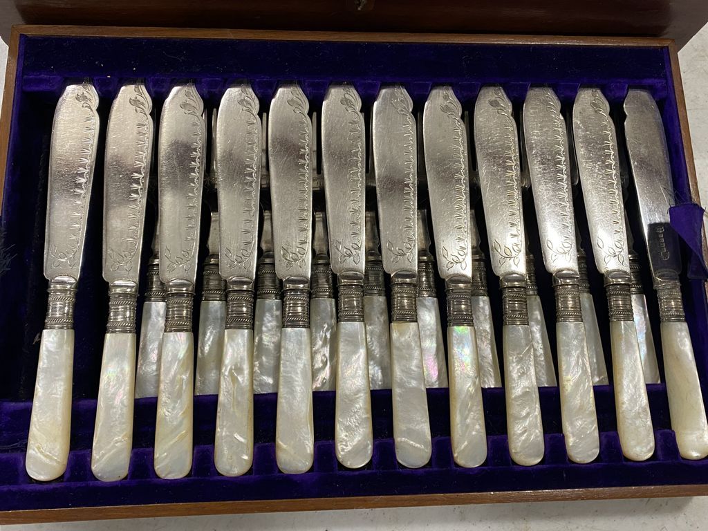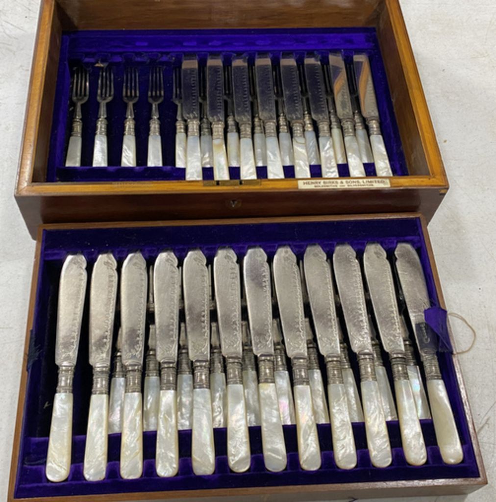 Henry Birks & Sons Limited Pearl Handled Flatware, 12 dinner knives, 10 forks, 12 luncheon forks, 42 pieces. Henry Birks & Sons Limited Pearl Handled Flatware, 12 dinner knives, 10 forks, 12 luncheon forks, 42 pieces.