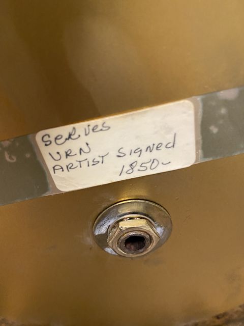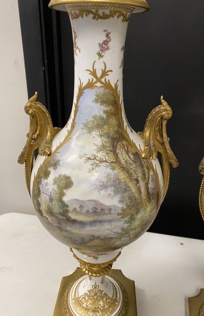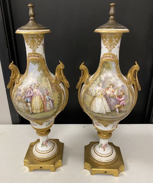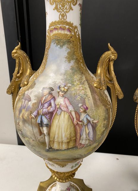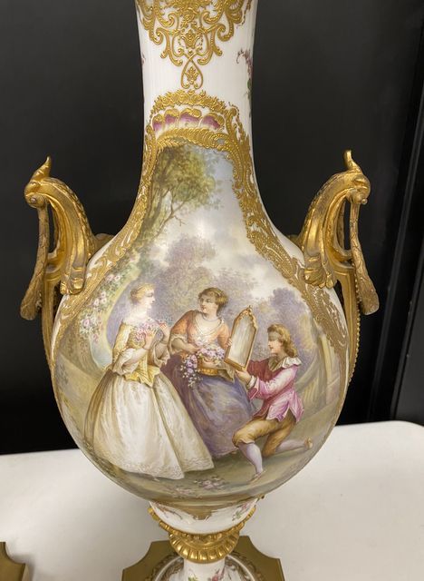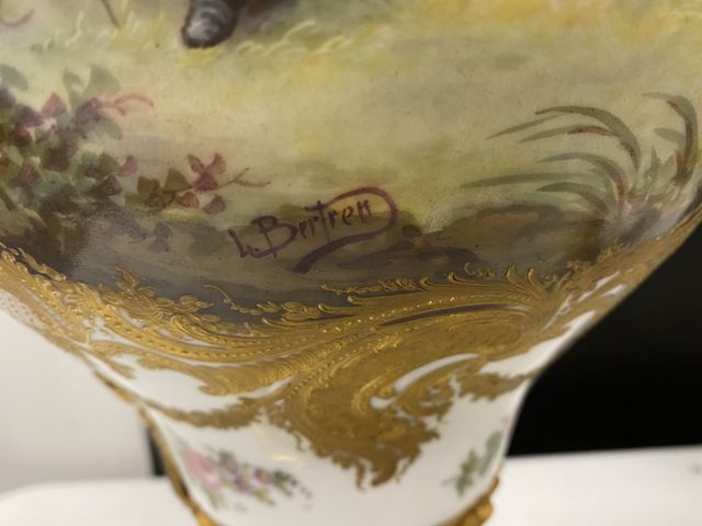 Pair of Hand Painted Serves Style French Urns, porcelain, artist signed L. Bertren, good condition. 29.5" h.,10" w.,8" d. Pair of Hand Painted Serves Style French Urns, porcelain, artist signed L. Bertren, good condition. 29.5" h.,10" w.,8" d.