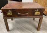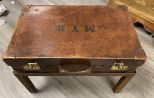 MYR Initialed Leather Suitcase on Stand, metal stand. 28" h., 26.5" w., 16 " d. MYR Initialed Leather Suitcase on Stand, metal stand. 28" h., 26.5" w., 16 " d.