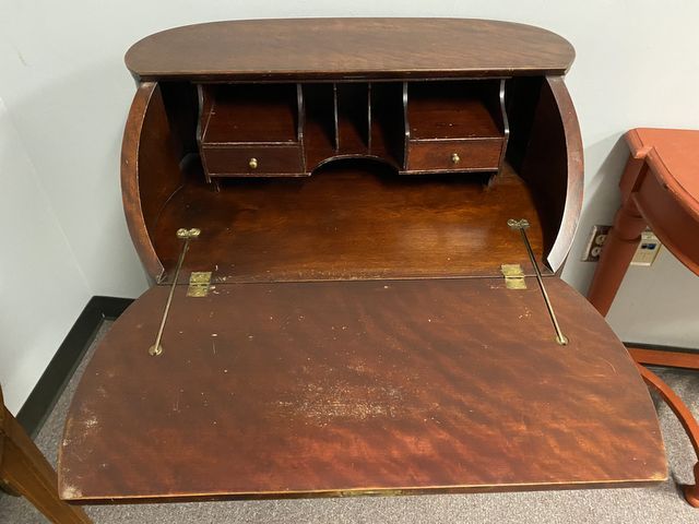 Vintage French Mahogany Secretary, drop front writing desk, has organizing slots, has scratches and wear. 38"h., 29"w., 18"d. Vintage French Mahogany Secretary, drop front writing desk, has organizing slots, has scratches and wear. 38"h., 29"w., 18"d.