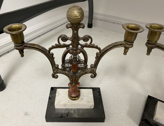 Brass Three Arm Candelabras, marble base, good condition. 8" h., 9" w., 4" d. Brass Three Arm Candelabras, marble base, good condition. 8" h., 9" w., 4" d.