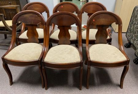Six Empire style dining chairs, upholstered cushions, mahogany, has wear spots on finish. Six Empire style dining chairs, upholstered cushions, mahogany, has wear spots on finish.