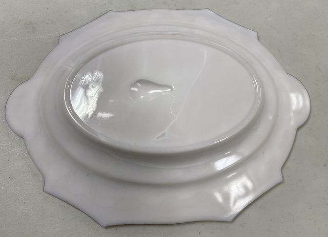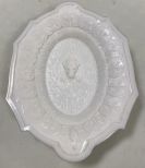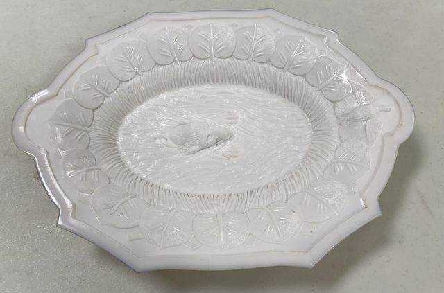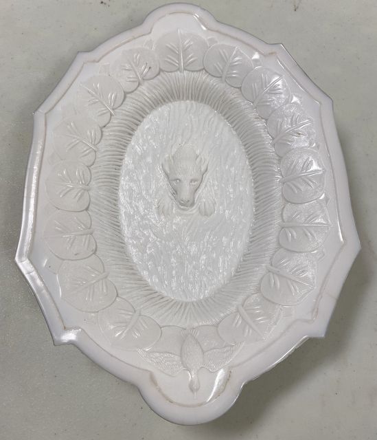 Art Milk Glass wolf platter, ornate design, good condition. 2" h., 9.7" w., 13.5" d. Art Milk Glass wolf platter, ornate design, good condition. 2" h., 9.7" w., 13.5" d.