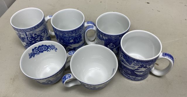 Spode Blue Room Collection, blue & white, 4 mugs, two cups, porcelain, modern pieces. Spode Blue Room Collection, blue & white, 4 mugs, two cups, porcelain, modern pieces.