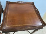 Pair of Amergold Hand Tooled Lamp Tables, mahogany, American Furniture Novelty Co., square top, light wear, 30"h., 19"w. Pair of Amergold Hand Tooled Lamp Tables, mahogany, American Furniture Novelty Co., square top, light wear, 30"h., 19"w.