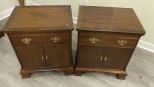 Pair of Hickory Chair Company Night Stands, James River plantation collection, single drawers, doors, mahogany, rings mark on one top, Chippendale style. 29" h., 24" w., 18" d. Pair of Hickory Chair Company Night Stands, James River plantation collection, single drawers, doors, mahogany, rings mark on one top, Chippendale style. 29" h., 24" w., 18" d.