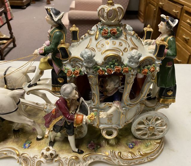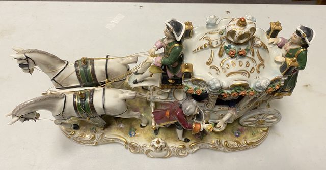 Dresden Style Porcelain Horse Carriage, hand painted, no damage. 10.5" h., 17" w., 4.5" d. Dresden Style Porcelain Horse Carriage, hand painted, no damage. 10.5" h., 17" w., 4.5" d.