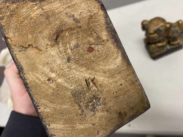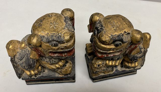 Vintage Wood Carved Foo Dogs, hand painted. 7" h., 5" w., 3" d. Vintage Wood Carved Foo Dogs, hand painted. 7" h., 5" w., 3" d.